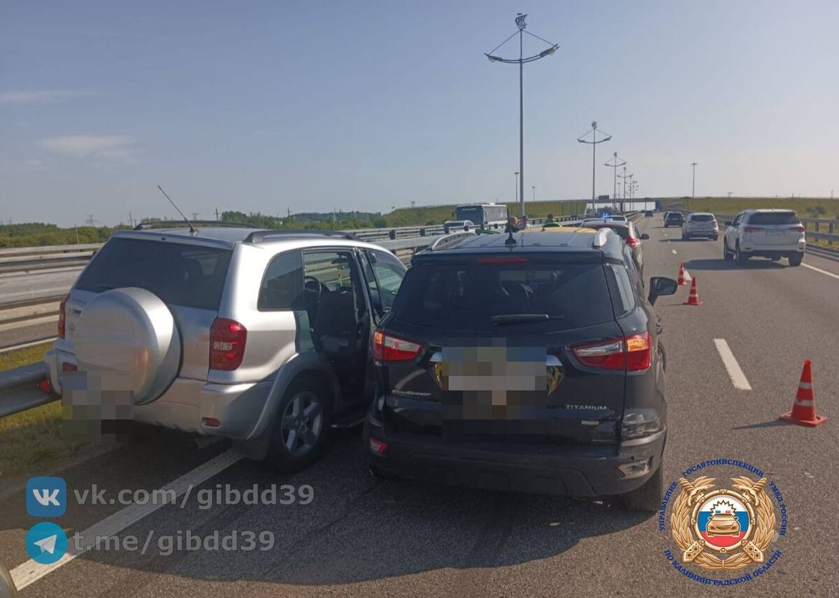 Гурьевский район По предварительным данным, 15.06.2025 года в 16 часов на 09 километре 650 метров автодороги «Приморское полукольцо» произошло дорожно-транспортное происшествие с участием двух автотранспортных средств. Водитель 1975 г.р., управляя автомобилем «Тойота», двигаясь по автодороге «Приморское полукольцо» со стороны пос. Храброво в направлении г. Калининграда, не учла интенсивность движения, выбрала не безопасный скоростной режим и дистанцию до впереди движущегося автомобиля «Форд», под управлением водителя 1961 г.р., в результате чего допустила столкновение с последующим наездом на дорожное ограждение слева по ходу движения. В результате ДТП пассажирка автомобиля «Тойота» 1977 г.р. получила телесные повреждения. Нарушение, повлекшее возникновение ДТП: - Неправильный выбор дистанции.