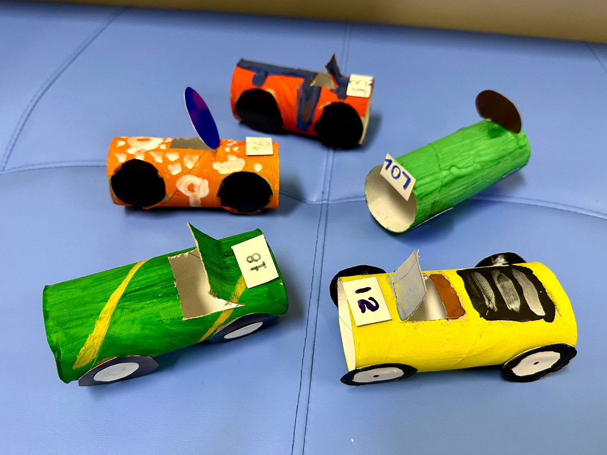 Настоящие автомобильные гонки прошли в детских отделения НМИЦ Бурденко. Для этого понадобились: втулки от туалетной бумаги, разноцветный картон, гуашь, кисточки, непроливайка, канцелярский нож, клей-карандаш, ножницы. И все дети и родители, которые пришли к нашим волонтёрам в игровую! - Мы начали с того, что раскрасили втулки самыми яркими цветами при помощи гуаши, - рассказывает координатор группы Полина Бролт. - Когда краска подсохла, нанесли вторым слоем узоры. Пока все сохло, из разноцветного картона вырезали для каждой машинки по пять кругов: четыре - для колёс и один - для руля. Канцелярский нож понадобится как раз для того, чтобы вырезать отверстие для руля: во втулке нужно сделать надрез буквой “П”, затем отогнуть картон наверх и приклеить на него руль. Колёса клеятся с двух сторон машинки на клей-карандаш. Мы приклеивали их чуть ниже середины втулки, чтобы машинка могла устоять. Почти готово! Осталось выбрать любимое число, написать его на небольшом прямоугольнике и повесить н