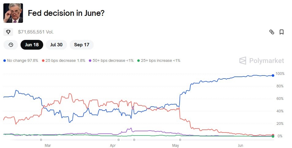 🔸По мнению пользователей платформы Polymarket, в эту среду ФРС, с вероятностью 97,5%, сохранит ставки на прежнем уровне.