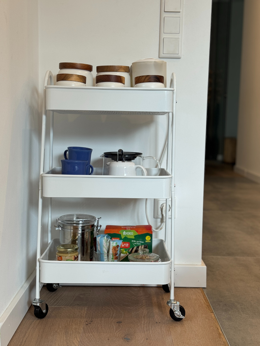 Такие стеллажи-тележки сейчас продаются во многих обычных магазинах и в интернете. Как правило, они идут в разобранном виде, но собрать их можно легко и быстро. Лучше выбирать модели на колесиках, потому что их можно передвигать с места на место. Эти многоуровневые тележки подойдут и для повседневного использования, и для гостей. И сейчас я вам покажу, как здесь создать уютный чайный уголок на колесах. На верхний ярус можно поставить чайник и коробки с вашим любимым чаем или кофе. При необходимости можно добавить сахарницу и чайные ложечки. Если вы храните чай в чайном органайзере, то можно поставить его. Для любителей декантирования и эстетичного хранения подойдут аккуратные одинаковые банки для чая и кофе. У меня здесь керамический вариант с герметичной деревянной крышкой, и на мой взгляд это самый оптимальный вариант хранения. В больших таких банках я храню кофе, а в банках поменьше – чай. Причем, хранить в них можно как рассыпчатый чай, так и в пакетиках. На среднем уровне можно р