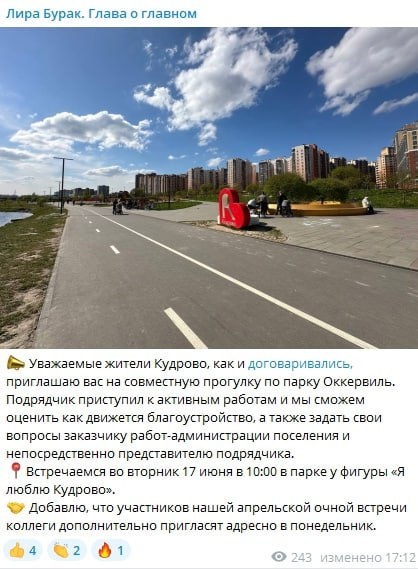 НОВОСТИ про ПАРК! 👻 Соседи, во вторник в парк Оккервиль приедет глава Всеволожского района Лира Викторовна Бурак. Напоминаю, данный этап благоустройства парка, как и предыдущий, реализуется на средства Всеволожского района. У нас с вами есть возможность задать вопросы подрядчику и заказчику (администрации Заневки) по текущим работам в парке, а также еще раз обозначить свое отношение к ряду уже реализованных объектов в парке, например, к ограждению. ‼️Встреча состоится 17 июня в 10 утра в парке у арт-объекта на фото. Наталья Широкова 🌇 Жизнь в Кудрово Есть новости? Пишите сюда.