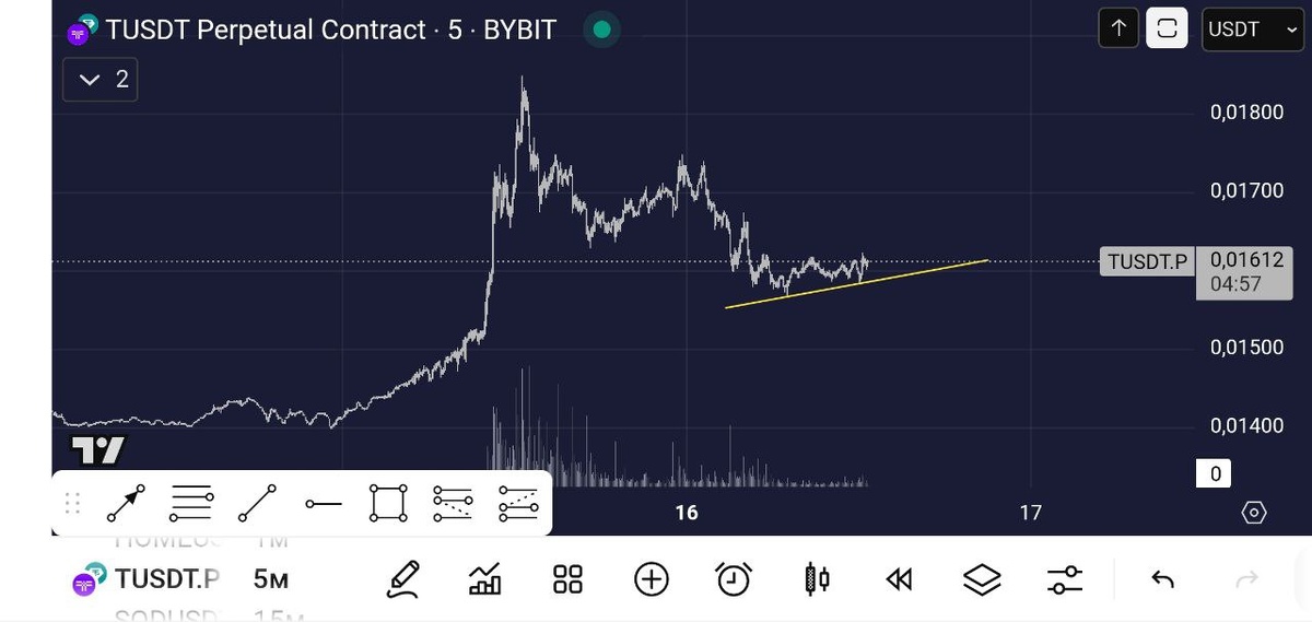 После пампа монета стекает. Я предполагаю, что упадем в район 0.01500. Нужно ждать третьего касания, а после него уже пробой наклонки.