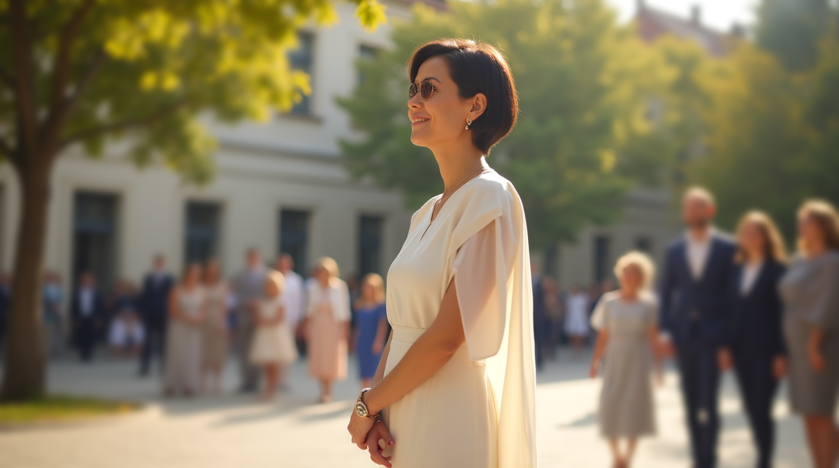 Такой образ хорош тем, что не привлекает внимание к одежде, а подчёркивает вас. Лёгкую, собранную, ту самую маму, которая пришла не блистать — а разделить важный день. Подойдёт тем, кто ценит классику без пафоса. Кто хочет быть нежной, но не сахарной. И оставить в памяти выпускной — не только в фотографиях, но и в ощущении.