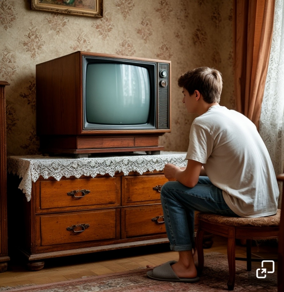 И самым величественным, самым загадочным экспонатом этого музея был большой, очень старый телевизор. Массивный, дубовый корпус, похожий на сундук. Его выпуклая линза, мутная от времени, искажённо отражала комнату. Несколько ручек настройки давно потерялись - остались лишь ржавые штырьки. Сверху он всегда был накрыт белоснежной кружевной салфеткой, вывязанной крючком самой Агафьей Степановной еще в молодости – будто саван для спящего монстра. Шнур питания был аккуратно свернут и спрятан за тяжелой тумбой. Агафья Степановна говорила, что "ящик" не работает лет сорок, но выбросить рука не поднимается – память.