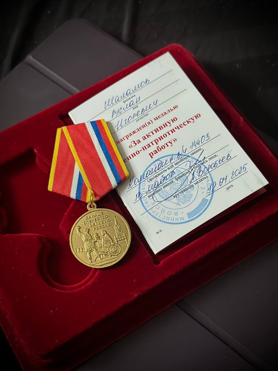 С гордостью сообщаю, что я был награждён медалью за активную военно-патриотическую работу на Курском направлении. Награду мне вручил командир в/ч 14403 гвардии майор Воробьев А.
