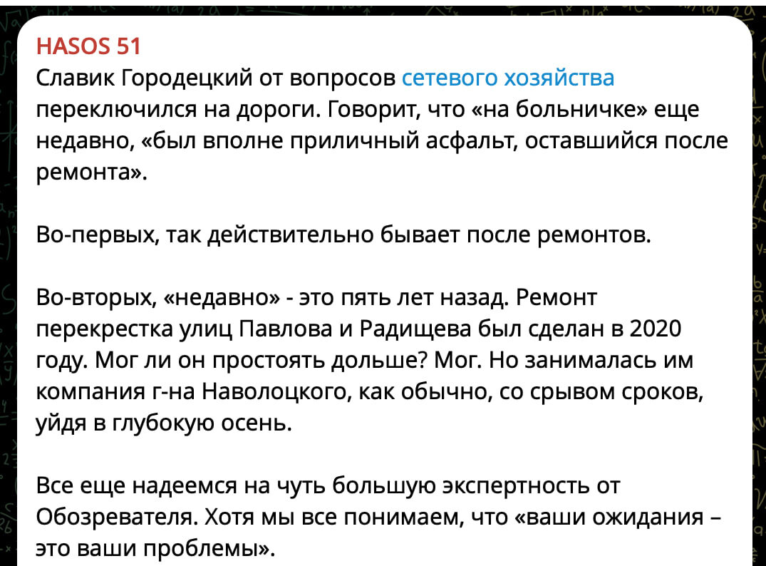В ответ на пост Что бы мы ни делали – получается одно и то же: либо КПСС, либо автомат Калашникова – В. С. Черномырдин Перефразируя афоризм Виктора Степановича, получается примерно следующее – какой бы подрядчик не ремонтировал мурманские дороги, это будет либо «Северстрой» либо «Север Строй». А в общем и целом, не нужно быть экспертом, чтобы отличить один плохой ремонт от такого же плохого. Просто вопрос времени – один асфальт сошёл через пять лет. Второй – через год. Один «Северстрой» (тот, который Александра Новолоцкого) уже без пяти минут банкрот и, разумеется, никаких гарантийных работ делать не будет. Да и срок уже скорее всего вышел – этот участок был отремонтирован по нацпроекту БКД в 2020 году. Второй «Север Строй» Оганеса Шанкояна, пока ещё «накачивается» деньгами, но юридически уже в Москве («поближе к кухне»), а значит ждать от него какого-то вменяемого ремонта не приходится. В качестве примера – улица Подгорная в Мурманске: и сделали откровенно плохо, а «ямочный ремонт»