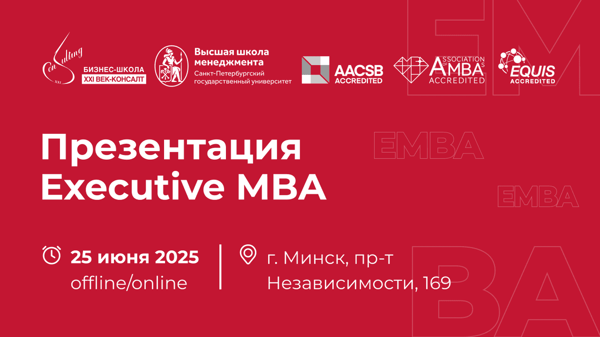 Образовательная программа Executive МВА позволяет получить современные знания об управлении бизнесом и ответить на эти и многие другие вопросы. Благодаря тому, что обучение реализуется 2 года в группе топ-менеджеров, каждый из которых имеет солидный профессиональный опыт, на выходе такое образование не только развивает управленческие компетенции, но и позволяет расширить сеть деловых контактов, сформировать почву для новых бизнес-возможностей и партнерств.БИЗНЕС-ШКОЛА XXI ВЕК-КОНСАЛТ совместно с Высшей школой менеджмента Санкт-Петербургского государственного университета реализует программу Executive MBA, которая была разработана в соответствии с самыми высокими международными стандартами.Обучение учитывает особенности ведения бизнеса в Беларуси и дает широкое представление о международной деловой среде, что позволяет понимать специфику различных деловых культур, а значит – успешно строить коммуникацию и развивать бизнес на внешних рынках. Этому способствуют, в том числе, зарубежные выездные модули, которые проходят в партнерских университетах и школах бизнеса.Данный образовательный продукт уникален и тем, что профессорско-преподавательский состав программы включает не только выдающихся представителей бизнес-образования Беларуси, но и профессионалов из лучших бизнес-школ мира. Слушатели совместной ЕМВА изучают 25 бизнес-дисциплин и защищают два аттестационных проекта: индивидуальный в конце первого года обучения и групповой в конце всей программы.Включенный в программу академический обмен является бесценным инструментом для постоянного роста: бесплатное участие в элективных курсах в группах EMBA партнерских университетов и школ менеджмента позволяет обновлять знания, находить новые подходы к решению управленческих задач и быть в курсе глобальных тенденций на протяжении всей карьеры даже после окончания программы.БИЗНЕС-ШКОЛА XXI ВЕК-КОНСАЛТ приглашает первых лиц компаний и членов их команд на презентацию Executive MBA, которая состоится 25 июня в 18.00 по адресу: г. Минск, пр-т Независимости, 169, БЦ «XXI век», 8 этаж. Возможно участие онлайн.На мероприятии вы:Узнаете о содержании программы и её преимуществах.Познакомитесь с преподавателями, выпускниками и потенциальными одногруппниками.Погрузитесь в атмосферу уникального образовательного продукта и получите всю информацию, касающуюся поступления.Подробности и регистрация по ссылке или по телефону +375 (29) 921 68 05.*Партнерский материал. ООО «ХХI ВЕК-КОНСАЛТ», УНП 190293096