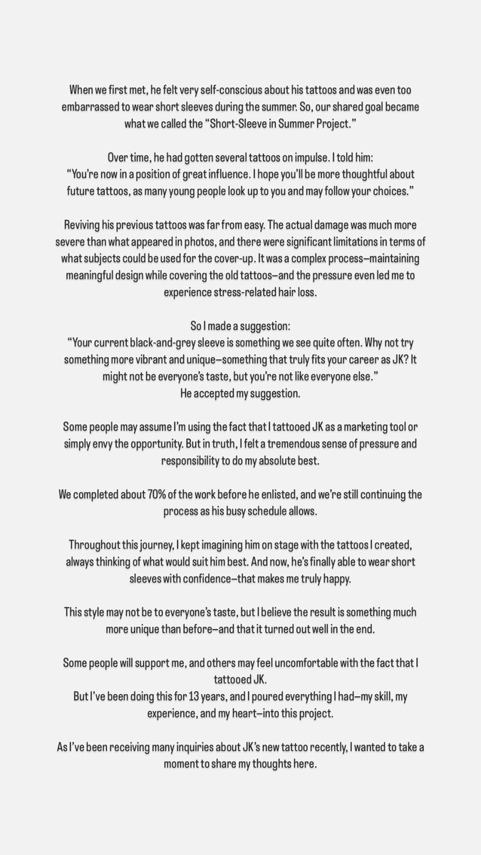 🍀 Тату мастер Polyc в Instagram story про новое тату Чонгука: Когда мы впервые встретились, он сильно стеснялся своих татуировок и даже стыдился носить одежду с короткими рукавами летом. Поэтому нашей общей целью стал так называемый “Проект “Короткий рукав летом””. Со временем он сделал несколько татуировок спонтанно. Я сказал ему: Сейчас ты находишься в позиции, где оказываешь большое влияние. Надеюсь, ты будешь более осознанно относиться к будущим татуировкам, ведь многие молодые люди смотрят на тебя и могут последовать твоему примеру. Обновить его старые татуировки было очень непросто. Реальное состояние кожи оказалось намного хуже, чем казалось на фотографиях, и были серьёзные ограничения по выбору тем для перекрытия. Это был сложный процесс — сохранить осмысленный дизайн и одновременно закрыть старые татуировки — и напряжение даже привело к тому, что у меня началось стрессовое выпадение волос. Тогда я предложил: Твоя текущая чёрно-серая татуировка на руке — это то, что мы в