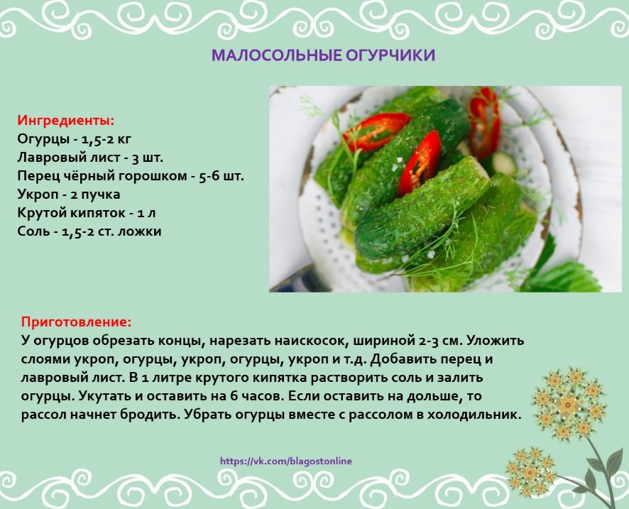 🥒 МАЛОСОЛЬНЫЕ ОГУРЧИКИ 🌀 Ингредиенты: Огурцы - 1,5-2 кг Лавровый лист - 3 шт. Перец чёрный горошком - 5-6 шт. Укроп - 2 пучка Крутой кипяток - 1 л Соль - 1,5-2 ст. ложки 🌀 Приготовление: У огурцов обрезать концы, нарезать наискосок, шириной 2-3 см. Уложить слоями укроп, огурцы, укроп, огурцы, укроп и т.д. Добавить перец и лавровый лист. В 1 литре крутого кипятка растворить соль и залить огурцы. Укутать и оставить на 6 часов. Если оставить на дольше, то рассол начнет бродить. Убрать огурцы вместе с рассолом в холодильник.
