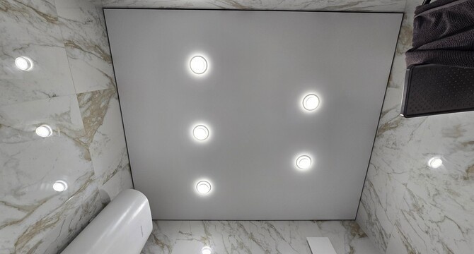 использовать ПВХ-потолки. Они способны удерживать до 150 литров воды на 1м² площади, что делает их более надёжными в случае непредвиденных ситуаций. После затопления воду можно слить, а полотно погреть тепловой пушкой — и потолок будет выглядеть как новый. Для компактного помещения, такого как санузел, рекомендуется выбрать глянцевую фактуру ПВХ натяжного потолка. Глянцевые потолки обладают отражающей поверхностью, которая визуально
