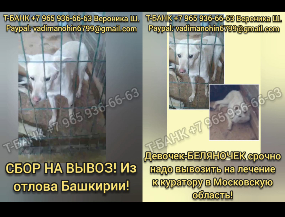 Девочки-Беляночки умоляют их спасти! Люди, помогите Вывезти из отлова! СБОР!.Они должны ехать в Московскую область к куратору на лечение! Друзья, нам нужно оплатить Беляночкам билетики в счастливую жизнь 🙏🙏🙏 Давайте поможем Девочкам остаться в живых и уехать из застенков отлова! Цена СЧАСТЬЯ ⚡18.000 руб⚡ Рейс Уфа --> Московская область + Зоотакси по области Любая сумма важна, каждая жизнь - бесценна 🙏🙏🙏 ✔️ карта Т-Банк номер: 2200 7009 8302 9884 привязана к телефону +7 965 936-66-63 Вероника Ш. с обязательной пометкой "Отлов УФА Вывоз БЕЛЯНОЧЕК" ✔️ Paypal: vadimanohin6799@gmail.com с ОБЯЗАТЕЛЬНОЙ пометкой "Отлов УФА Вывоз БЕЛЯНОЧЕК" Личный контакт волонтёра: +7 965 936-66-63 (телефон и ватсап) ВЕРОНИКА Если Вы тоже можете и хотите забрать собаку из отлова, подарив ей этим Жизнь - заходите! Собаки так ждут Вас..так надеются, что Вы их спасёте....https://t.me/katalog_sobak_ufa Пожалуйста, подписывайтесь на наши каналы, чтобы быть в курсе новостей, сбора, вывоз