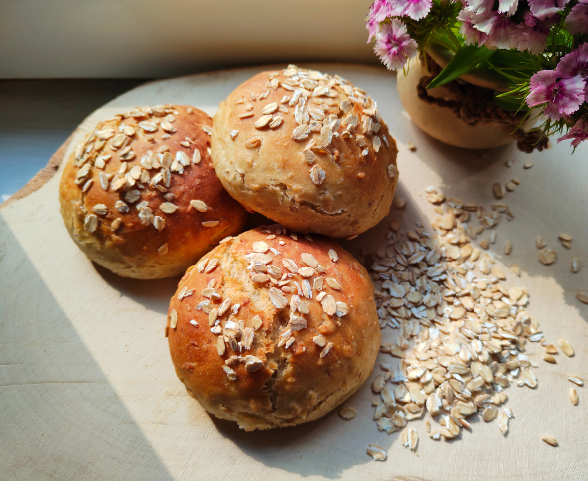 Аппетитные и полезные булочки из необычного теста, в котором присутствует и кефир, и дрожжи. Булочки не сладкие, мы их едим вместо белого хлеба: - овсяные хлопья 1 стакан + немного на посыпку - кипяток 1 стакан - кефир 1 стакан - мёд 3 ч.ложки - дрожжи быстродействующие 6 г (1 ч.ложка) - масло растительное 50 г - соль 1 ч.ложка - сода пищевая 1/2 ч.ложки - мука пшеничная 1 сорта или цельнозерновая примерно 550 г Заливаем овсяные хлопья кипятком. Добавляем 2 ч.ложки мёда, перемешиваем. Накрываем и оставляем на 1 час: В стакан тёплого кефира (30 секунд в микроволновке) добавляем 1/2 ч.ложки соды и 1 ч.ложку соли. Мешаем лопаткой в течение минуты, чтобы сода погасилась: Добавляем распаренную овсянку вместе с жидкостью: Всыпаем примерно половину всей муки и 1 ч.ложку сухих дрожжей: Перемешиваем лопаткой. Вливаем растительное масло: Добавляем оставшуюся муку: Замешиваем тесто. В норме оно очень липкое, поэтому если есть тестомес или достаточно мощный миксер с насадкой "крюки", можн