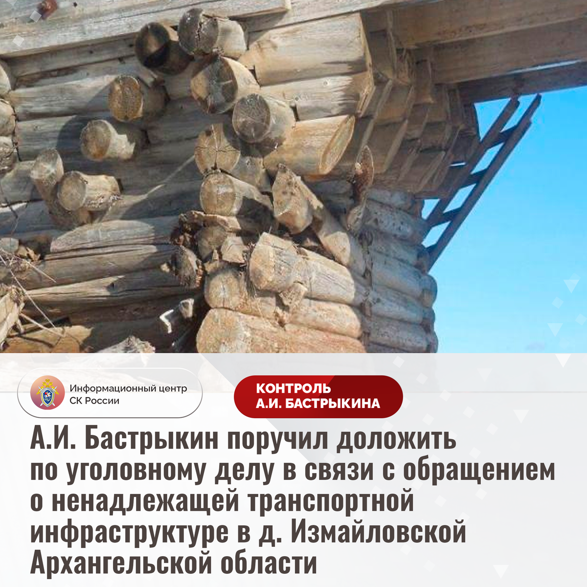 А.И. Бастрыкин поручил доложить по уголовному делу в связи с обращением о ненадлежащей транспортной инфраструктуре в д. Измайловской Архангельской области В Информационный центр СК России поступило обращение по вопросу продолжающегося нарушения прав жителей Плесецкого муниципального округа Архангельской области на качественную транспортную инфраструктуру. Длительное время мост через реку Кена в деревне Измайловской, являвшийся объектом культурного наследия регионального значения, находился в непригодном состоянии: его деревянные элементы прогнили и деформировались, конструкции разрушились. В июне прошлого года после многочисленных обращений граждан в уполномоченные органы небезопасная переправа была демонтирована, а в ноябре началось возведение нового сооружения. Однако до настоящего времени строительные работы не завершены. В результате жители фактически находятся в изоляции и в случае возникновения чрезвычайных ситуаций не смогут оперативно получить помощь экстренных служб. Ситуация