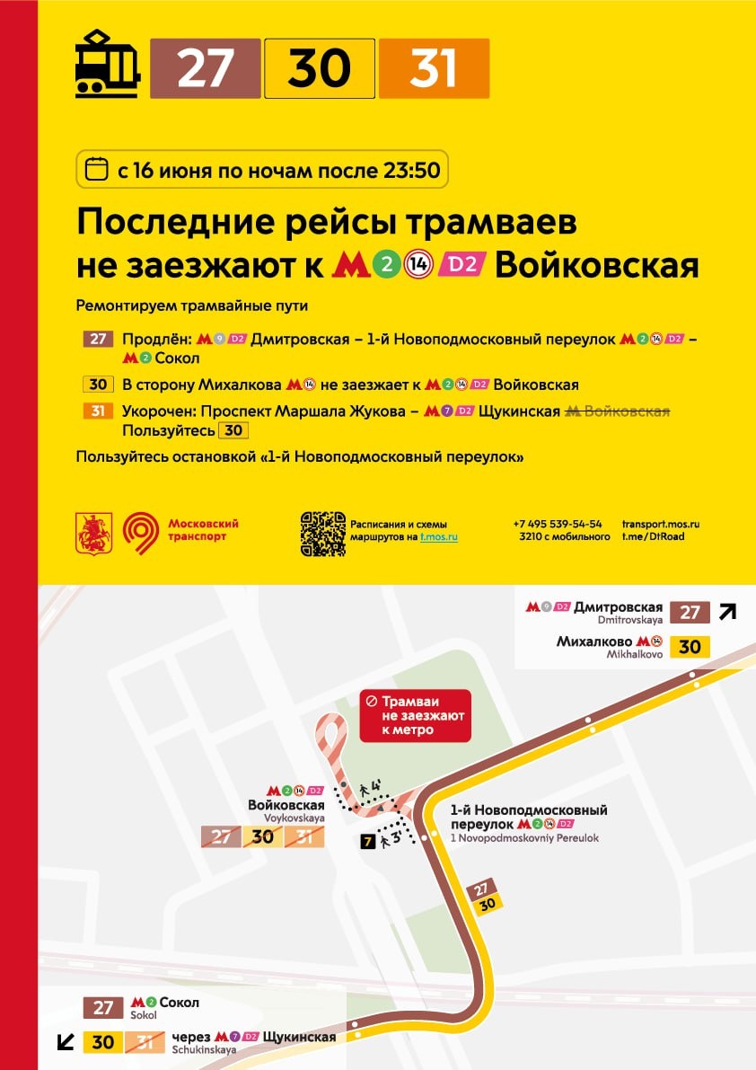 ⚠️ С 16 июня по ночам после 23:50 трамваи не будут заезжать на разворотное кольцо у метро «Войковская».