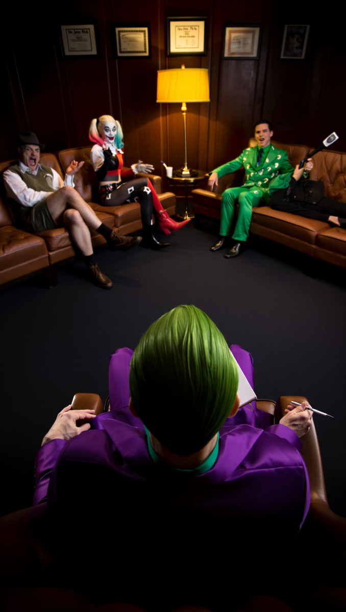 Тёмная, немного мрачная комната, вокруг — диваны и кресла. На переднем плане — Джокер, ухмыляющийся и держащий блокнот. 🃏 Джокер (с притворным сочувствием):