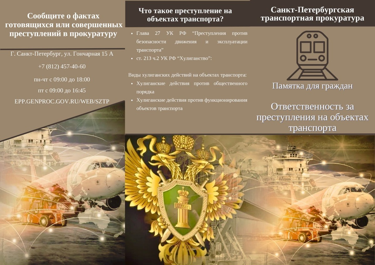 В рамках реализации мероприятий по правовому просвещению и профилактике деструктивного поведения среди молодежи Санкт-Петербургская транспортная прокуратура подготовила памятку об ответственности за преступления и правонарушения на объектах транспорта.