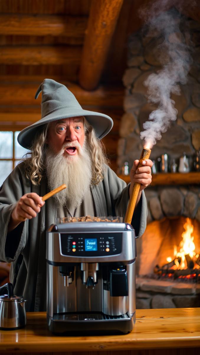 — Эта штуковина... капризнее дракона после неудачного боя. Он нажимает на кнопку — кофе-машина издаёт жалобное «пфффф», но не варит. 🎩 Гэндальф (саркастично):