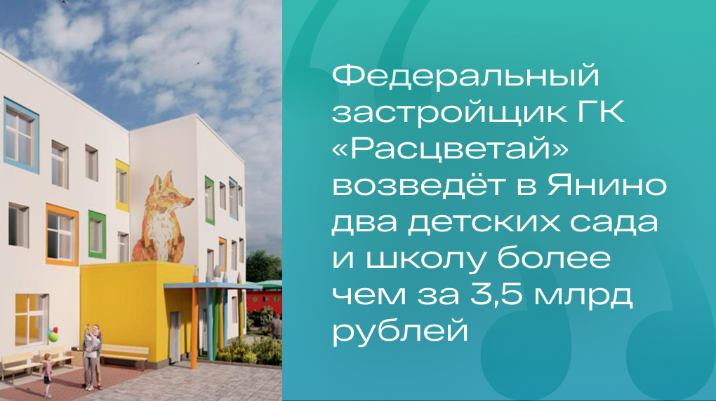 Федеральный застройщик ГК «Расцветай» возведёт в Янино два детских сада и школу более чем за 3,5 млрд рублей