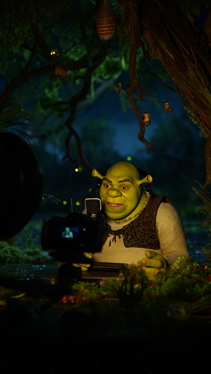 Тёмный лес, редкие лучи солнца пробиваются сквозь густые кроны. Шрек сидит на пне с микрофоном и камерой, стараясь говорить тихо и расслабленно. 🗣️ Шрек (шёпотом):
