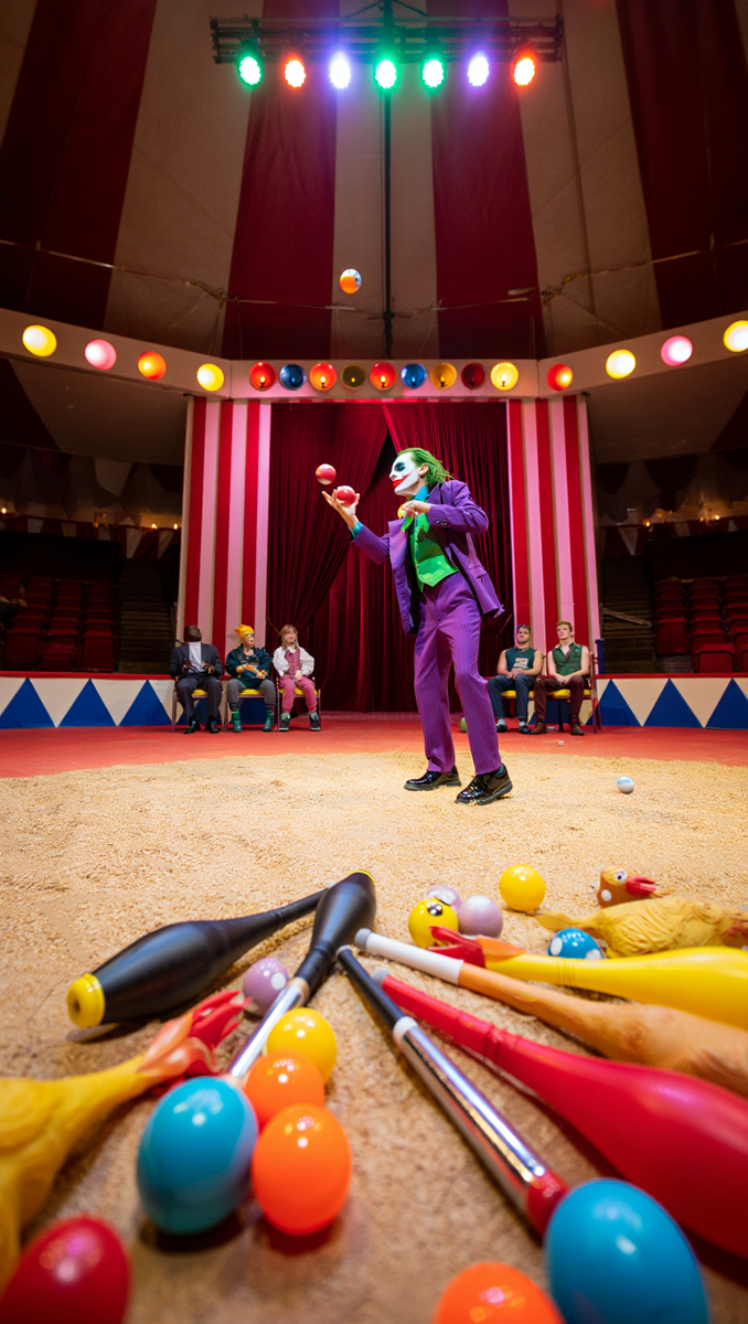 В одном мрачном уголке цирковой арены, под яркими, но слегка тусклыми огнями 🎭, Джокер с ухмылкой, как будто он только что придумал самый жуткий шутливый заговор, объявляет: «Добро пожаловать на урок комедии для злодеев! 🎉 Сегодня вы научитесь не только смеяться, но и кидать мячи так, чтобы они летели прямо в твои планы... или в твою голову! 🃏🎈» Злодеи разного калибра стоят в очереди, не совсем понимая, зачем им учиться веселиться. Харли Квинн с клоунским носом и перьями в волосах хлопает в ладоши, а Пингвин пытается крутить мяч на пальце, но мяч падает и катится под ноги Бэйну. Вдруг Джокер поднимает огромный красный мяч 🎾 и кричит: «Сейчас будет самый крутой трюк!» И — бум! — мяч взрывается конфетти и разноцветным дымом, заставляя всех чихать и хлопать в ладоши одновременно 🤡💥🎉. Но самый неожиданный момент — когда из-за кулис выпрыгивает Бэтмен в костюме клоуна и громко кричит: «Я хочу тоже!» Все заливаются смехом, а Джокер шепчет: «Ну вот, теперь это действительно цирк!» 📢