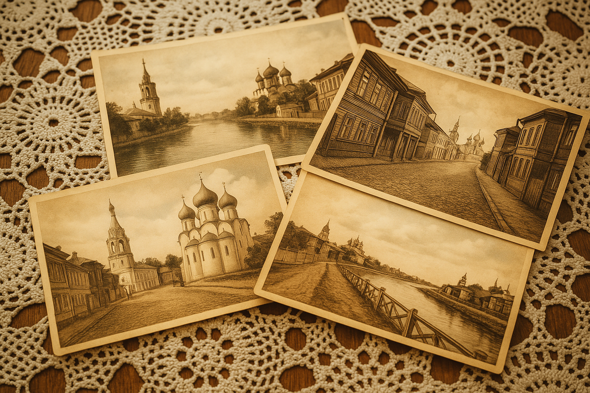 Река Вологда давно перестала быть судоходной артерией, но её облик остался на десятках почтовых карточек, которые разлетелись по всей России ещё в начале XX века. На дореволюционных открытках — берег без асфальта, деревянные мостки, телеги с сеном, вологжане в кафтанах и шляпах.