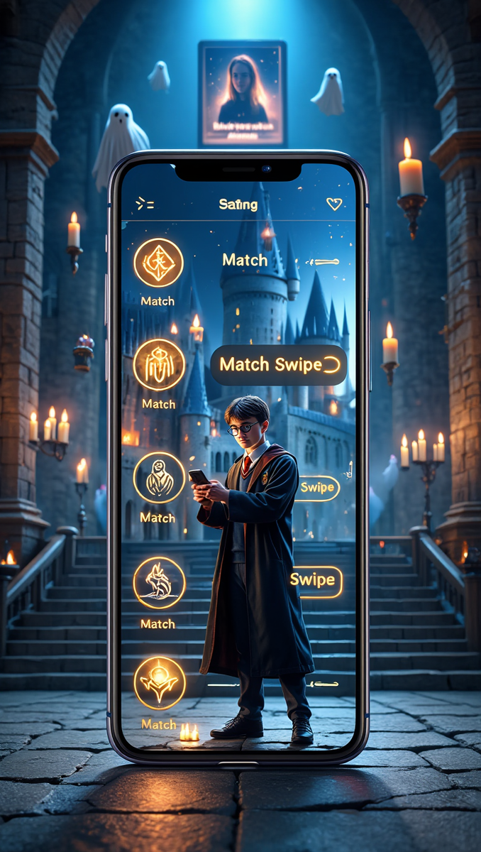 Гарри, одетый в свою школьную мантию, сидит в Хогвартсе — но не на уроке, а уминая бутерброд и пытаясь понять, как работает новое магическое приложение для знакомств — «МагиМэтч» ✨📲. Интерфейс переливается цветами и звенит звонками уведомлений — «Связь с дементорами? Нет, спасибо!» — Гарри вздыхает. «Почему все профили либо оборотни, либо гигантские пауки? 🐺🕷️» Он листает: одна ведьма пишет: «Люблю длинные прогулки по Запретному лесу и отваривать зелья», другая — «Победила в Турнире Трёх Волшебников, ищу партнёра для дуэлей и кофе» ☕️⚡️. Гарри зачитывает вслух смешные уведомления: — «Внимание! Твой сосед по комнате Рон хочет поделиться шоколадными жабами! 🐸🍫»