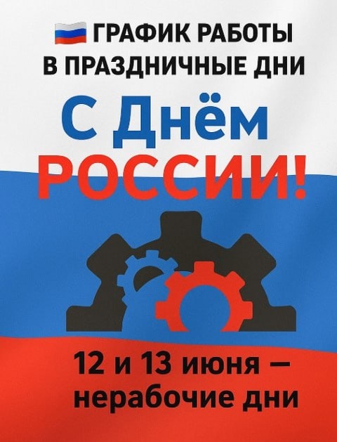🇷🇺График работы в праздничные дни 🇷🇺 Дорогие партнёры и клиенты! Поздравляем вас с грядущим Днём России — праздником единства, силы и будущего нашей страны! 🗓 В связи с праздниками хотим оповестить о графике нашей работы: 11 июня - сокращенный день с 9:00 до 17:00 12 и 13 июня — нерабочие дни. С 14 июня (пятница) — работаем в обычном режиме. Желаем вам провести эти дни с пользой, в кругу близких или на природе — с хорошей погодой и настроением! А мы вернёмся к работе уже в пятницу, чтобы оперативно отвечать на ваши заявки и вопросы.