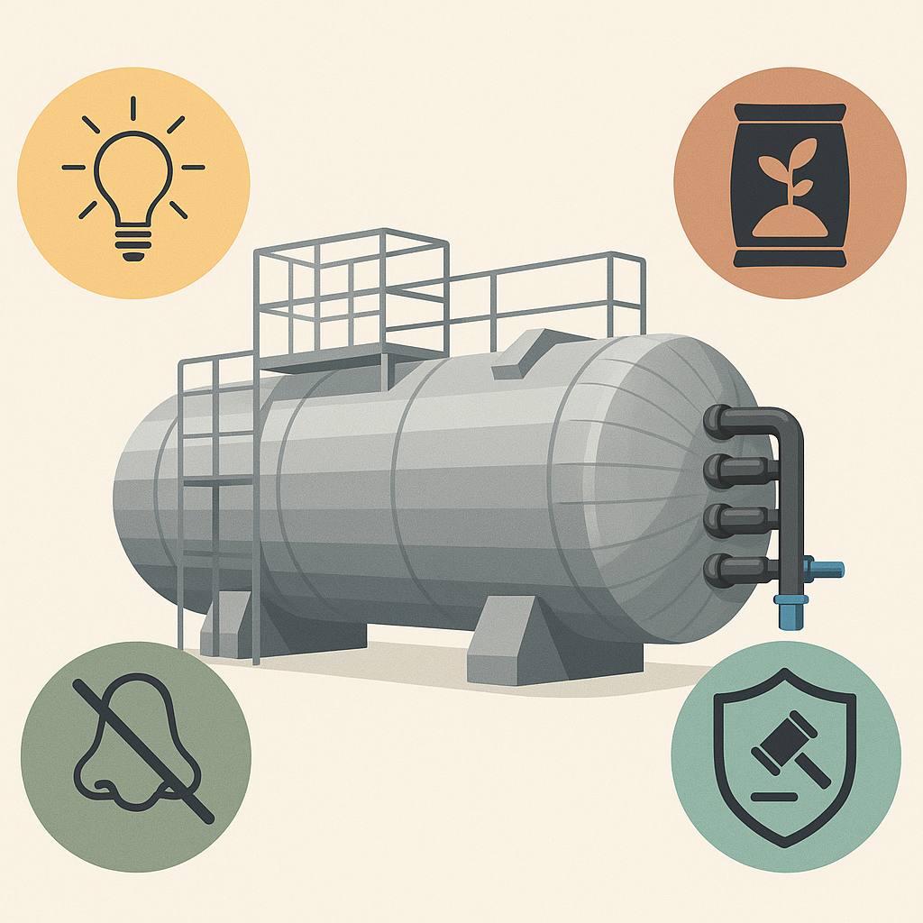 Субсидии получить трудно, окупаемость — не завтра. Но главное не в этом. Биогазовая установка — это путь к свободе: вы сами производите энергию, снижаете расходы на удобрения, легализуете отходы и избегаете штрафов. Один комплекс — и у вас под контролем то, что раньше было головной болью.