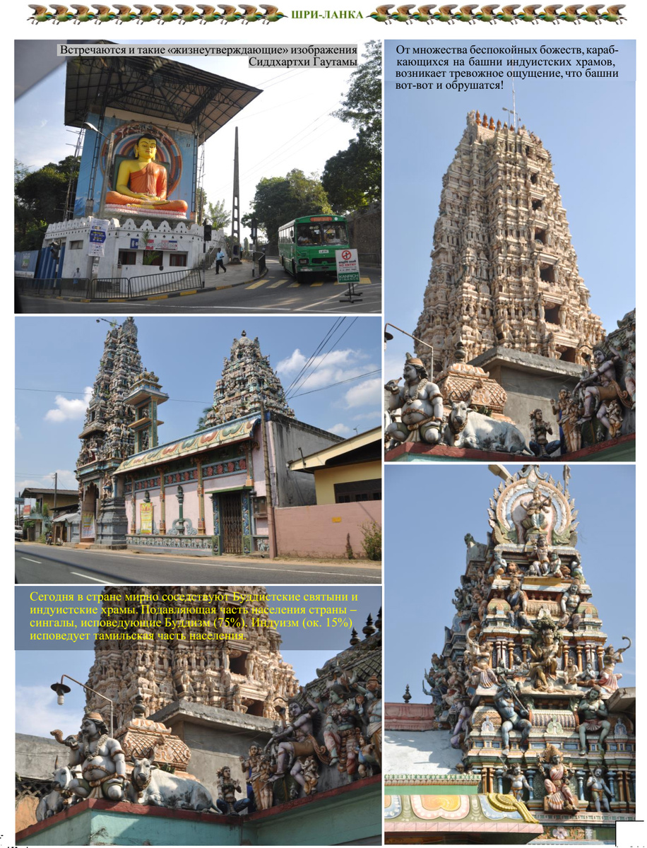 ШРИ-ЛАНКА Сегодня в стране мирно соседствуют Буддистские святыни и индуистские храмы. Подавляющая часть населения страны – сингалы, исповедующие Буддизм (75%). Индуизм (ок. 15%) исповедует тамильская часть населения. Встречаются и такие «жизнеутверждающие» изображения Сиддхартхи Гаутамы – на фото сверху, слева. От множества беспокойных божеств, карабкающихся на башни индуистских храмов, возникает тревожное ощущение, что башни вот-вот и обрушатся! – на фото сверху, справа. СКАЗОЧНЫЕ ОБРАЗЫ ИЗ ИНДУИСТСКОГО ПАНТЕОНА Индуизм - одна из наиболее крупных по числу последователей религий мира, сформировалась в 1-м тыс. н.э. Основа индуизма - учение о перевоплощении душ (сансара), происходящем в соответствии с законом воздаяния (карма) за добродетельное или дурное поведение. Два основных направления связанны с культами верховных богов Шивы и Вишну. Культовые обряды совершаются в храмах и священных местах. Помимо бесчисленных божеств почитаются и священные животные (корова, змея), и реки (Ганг),