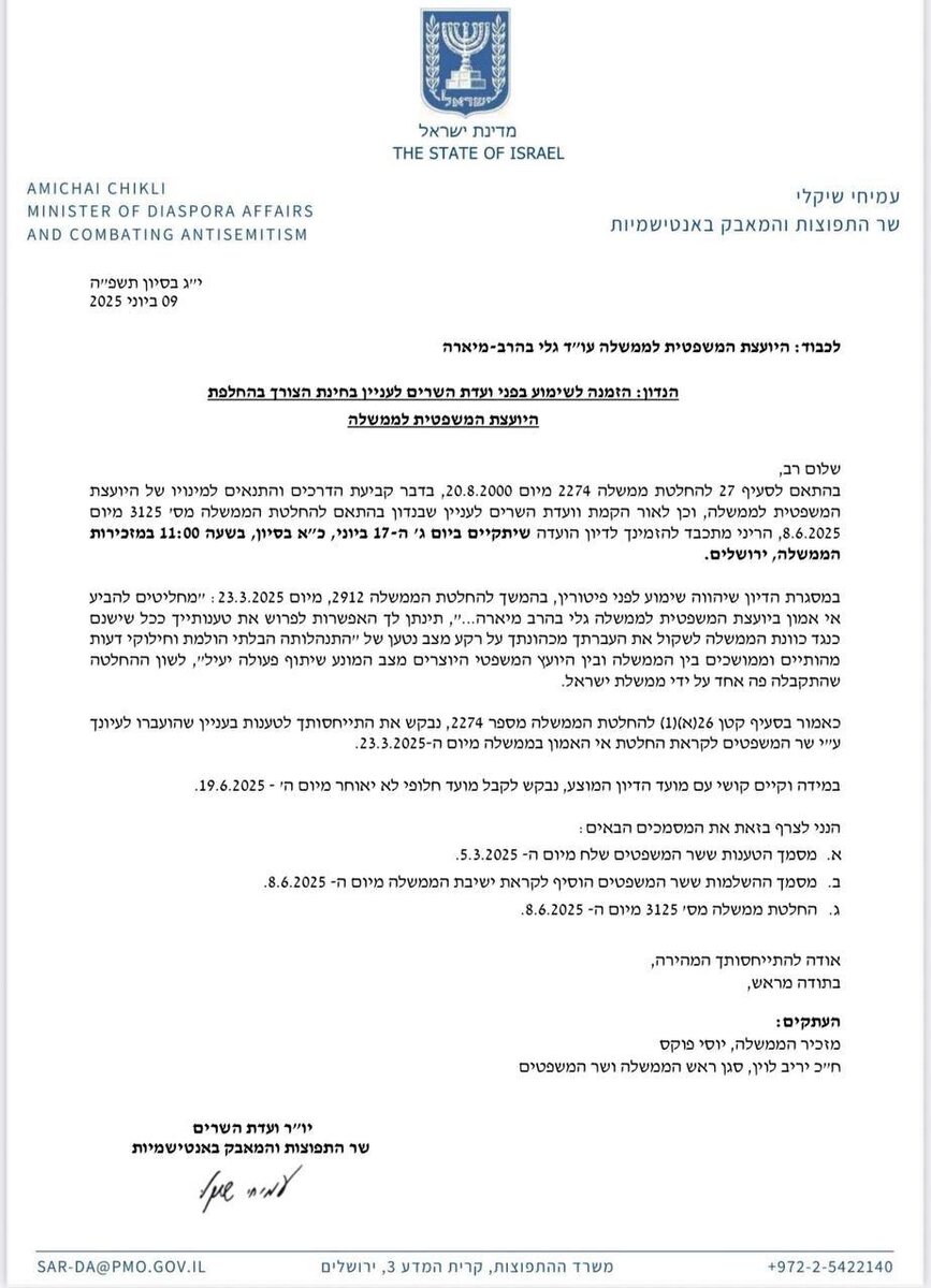 Продвижение в вопросе отставки юридического советника. Министры пригласили ее на увольнительное собеседование (шимуа), которое традиционно проводится перед тем, как расстаться с любым сотрудником. Проблем только в том, что состав комиссии не совсем тот, что принят. Но кого в нынешнем правительстве волнуют такие условности.