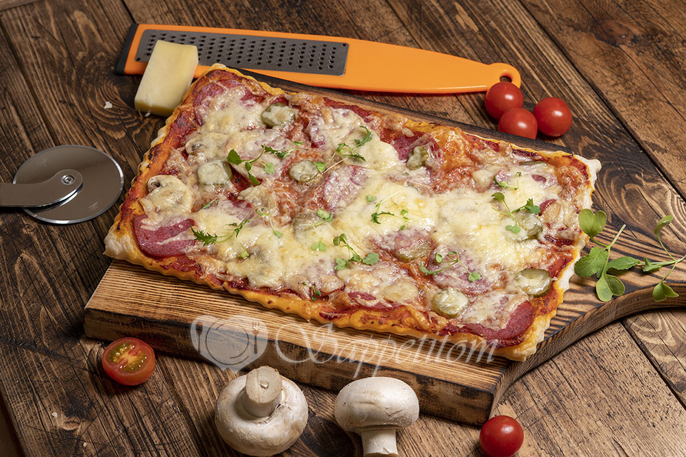 Простая и вкусная пицца из слоеного теста, домашним томатным соусом, шампиньонами и сыром Чеддер не оставит Вас равнодушным. Пряная салями, небольшая кислинка томатов, нежный расплавленный Чеддер и ароматные шампиньоны – именно такой получается эта пицца. У каждой хозяйки есть свой вариант приготовления пиццы - кто-то готовит пиццу на тонком тесте, а кому-то наоборот нравиться тесто потолще. Да и видов самой начинки существует тысячи вариантов. Сегодня я хочу поделиться с Вами одним из вариантов приготовления пиццы. Мы с Вами просто, легко и быстро соберем воедино очень красивую и вкусную пиццу. Основой для этого блюда послужит готовое бездрожжевое слоеное тесто – оно даст нам тоненькую хрустящую лепешку. Я расскажу Вам как приготовить быстрый вариант томатного соуса, но можете взять любой по вашему вкусу. А сыра, если хотите, добавьте побольше – это дело вкуса. слоеное тесто - 1 лист (250 гр.)