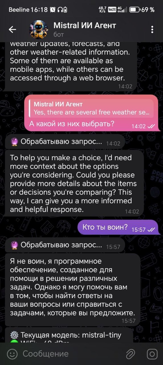 💡 Что, если… ваш телеграм-бот работал бы на микроконтроллере? Я собрал ИИ-ассистента на базе Mistral AI, который: - 📱 Отвечает в Telegram (да, даже с ESP8266!) - 🤖 Понимает команды: /ask, /status, /debug - 🔥 А ещё умеет падать — но это фича, не баг! 🔧 Технологический зоопарк: - C# (временный хост, пока ESP32 в пути 🚚) - Mistral API (mistral-tiny — экономим токены) - ArduinoJson (спасибо, что ты есть) // Когда на ESP8266 кончается память: if (OutOfMemory) { Console.WriteLine("Активируем резервный C#-режим!"); SendToTelegram("Извините, я сейчас немного перегружен..."); } Почему это круто? ✅ Универсально:C# для теста, потом — ESP32 с Wi-Fi ✅ Open Source Friendly (хотите код? Пишите в комменты!) ✅ Можно доработать: голос, IoT-триггеры, нейросеть на edge 🔗 Потестировать бота: Mistral ИИ P.S. Если ESP32 не приедет — будем запускать на стиральной машине. P.P.S. Да, я знаю про Rust, но сегодня был день C#.