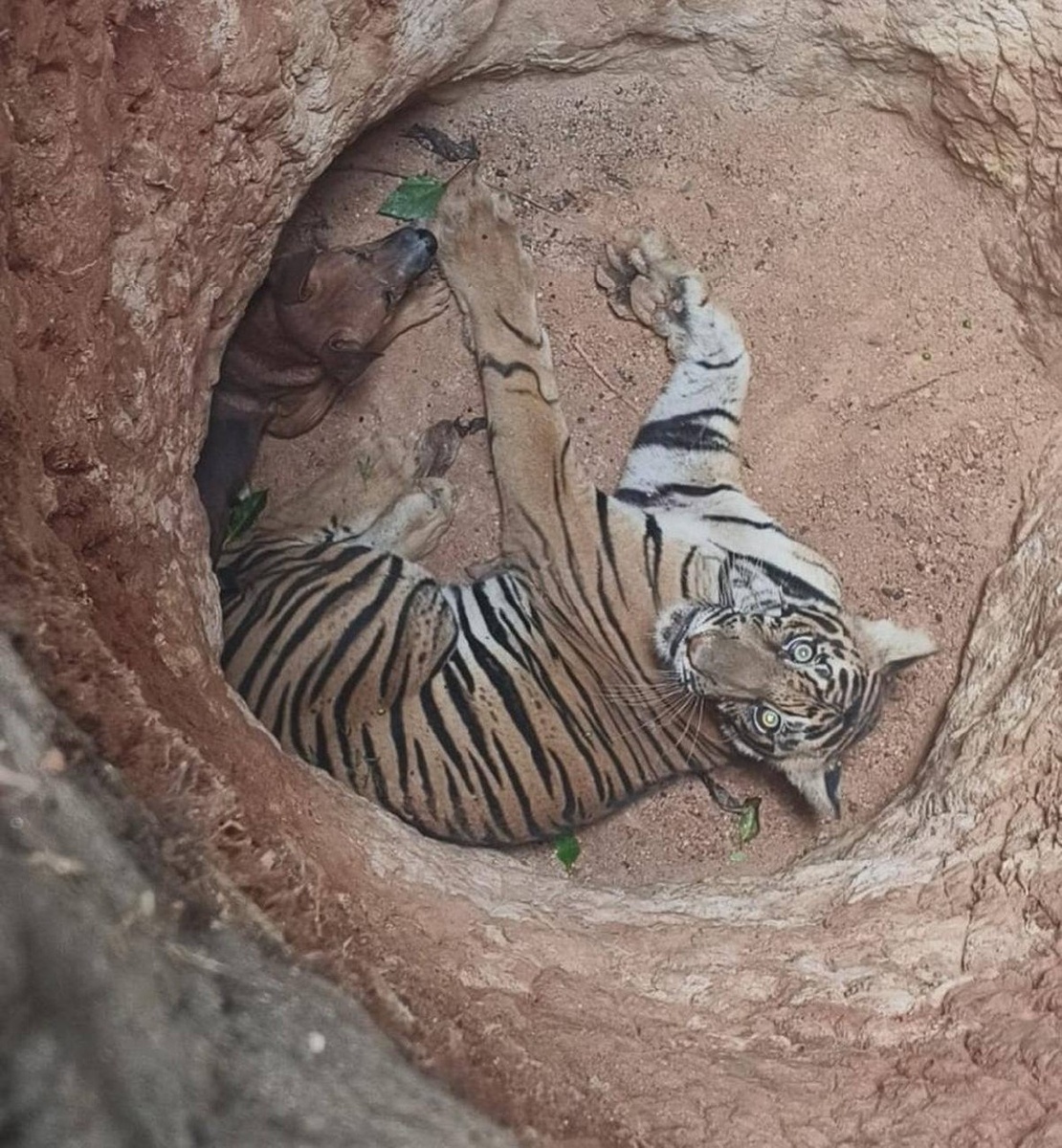 В Индии дикие животные продолжают проваливаться в разного рода ямы… На этот раз в штате Тамилнад тигр упал в яму для компоста глубиной 4.5 метра вместе с собакой. И тигр, и собака, как сообщается, невредимы, хотя в яму их привела предположительно погоня дикого хищника за домашним животным. Пишут, что планируется вызволить животных, но о результате операции пока не сообщалось. 🐯 Центр «Амурский тигр»