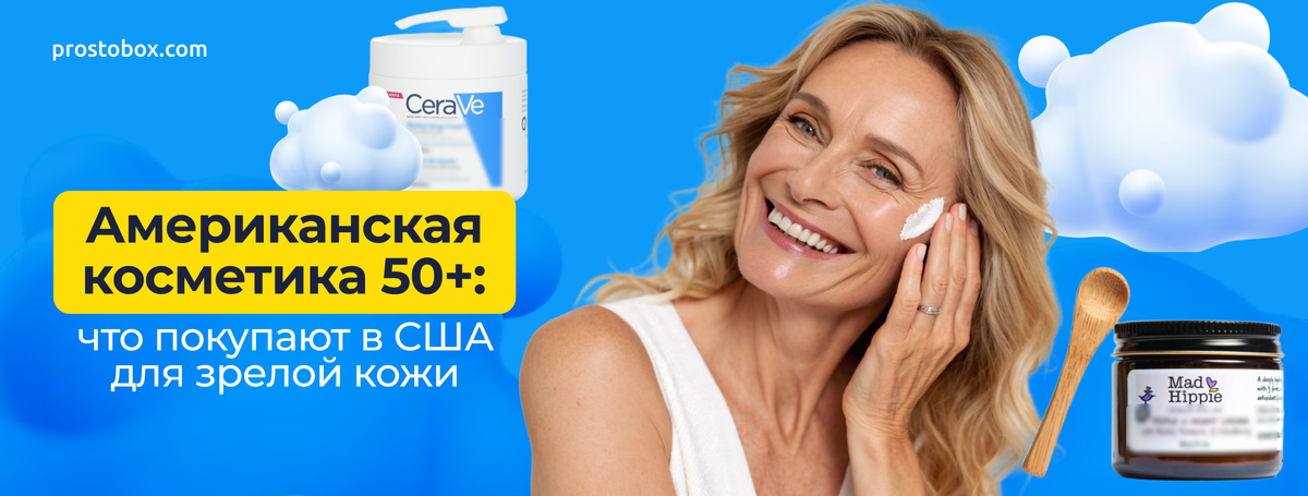 Возраст – не повод отказываться от ухода, а наоборот: сейчас, как никогда, коже нужна поддержка. Американки 50+ давно это поняли и активно пользуются уходовой косметикой, которая действительно работает. При этом многие бренды не стоят баснословных денег, а заказываются прямо на iHerb или Amazon через наш надёжный сервис Prostobox.com и легко доставляются в Россию и другие страны. Почему американская уходовая косметика так популярна? Топ уходовых брендов с iHerb и Amazon: 1. CeraVe (iHerb, Amazon) Недорогой, но очень качественный аптечный бренд. Увлажняющие кремы, очищающие гели и сыворотки с керамидами и гиалуронкой. Отлично подходят для сухой, чувствительной и зрелой кожи. 2. Neutrogena (iHerb, Amazon) Легендарный бренд с линейками для любого возраста. Серия Rapid Wrinkle Repair с ретинолом отлично работает с морщинами и неровным тоном. 3. Mad Hippie (iHerb) Натуральный и деликатный уход с высокой эффективностью. Часто используют витамины C, E, феруловую кислоту, пептиды. 4. Derma E (