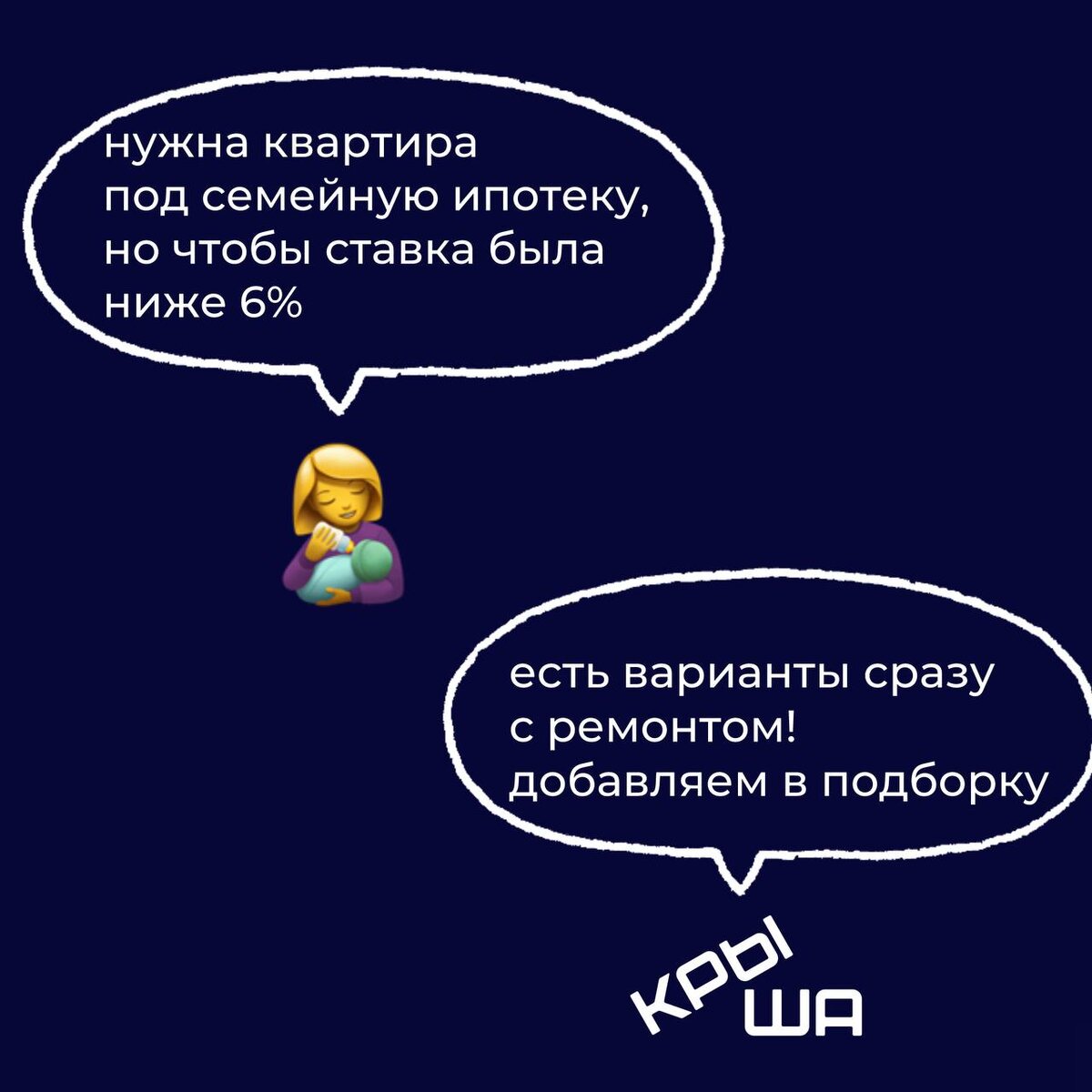 Как платить за квартиру меньше, чем ваши соседи? 🧐 Помните, как было при окончании господдержки? Девиз: «Или сейчас, или никогда!» И те, кто не побоялся купить квартиру под 7-9% в 2024 году, сейчас чувствуют себя королями, поглядывая на ставки до 30% 👉🏻 Тоже самое сейчас и с семейной ипотекой — уже в июне её могут расширить для семей с детьми до 14 лет, а значит, увеличится и спрос Вот и представьте, что в одном доме живут Вася и Петя: только Вася успел взять квартиру под 3.5%, а Петя переплачивает за такое же количество квадратов в 2 раза больше 🤷 Сегодня у вас есть возможность взять квартиру по сниженной ставке от 2.2% до 4.5% (при стандартной ставке в 6%), без первоначального взноса и даже сразу с ремонтом Но будет ли такая возможность завтра? Именно поэтому важно покупать квартиру уже сейчас — пока есть акции от застройщиков и выбор локаций и планировок Указывайте критерии будущего семейного гнездышка по ссылке, а мы вышлем лучшие варианты и расскажем о самых горячих ски