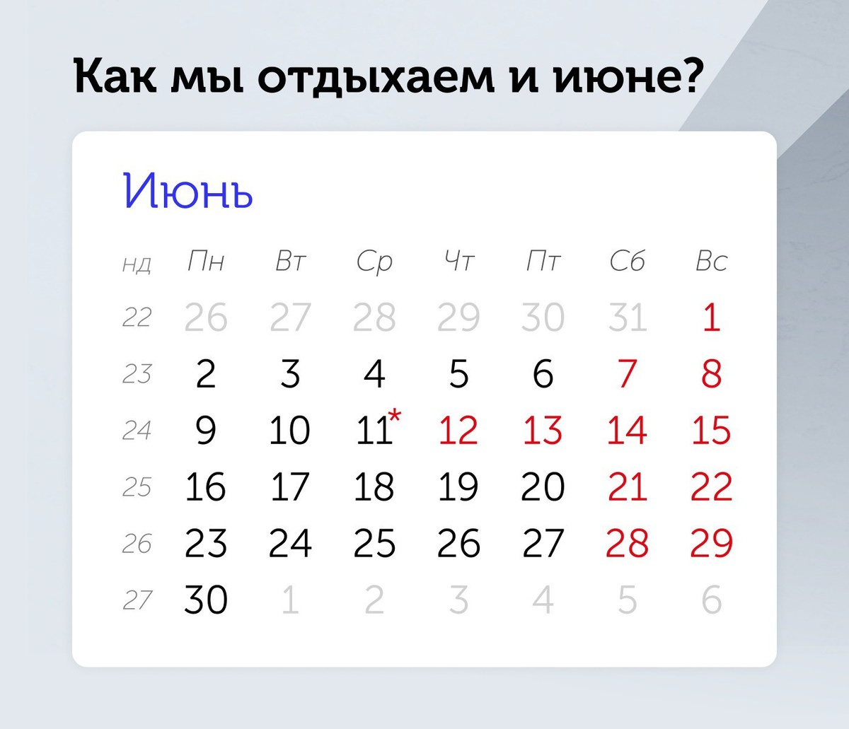 🌿 Как мы отдыхаем и работаем в июне 2025? Для тех, кто трудится по пятидневке, майские праздники остались позади, а вот июнь принесёт ещё несколько дополнительных дней отдыха. 🎉 с 12 по 15 июня, отдыхаем 4 дня. 12 июня — День России (официальный выходной) 13 июня — перенесённый выходной (с 8 марта) 14 и 15 июня — обычные выходные дни ⚠ Что важно помнить: 11 июня (среда) — сокращённый рабочий день. Продолжительность работы сокращается на один час. Постарайтесь распланировать нагрузку заранее! 📅 Полный календарь рабочих и праздничных дней на 2025 год вы найдёте в нашем производственном календаре