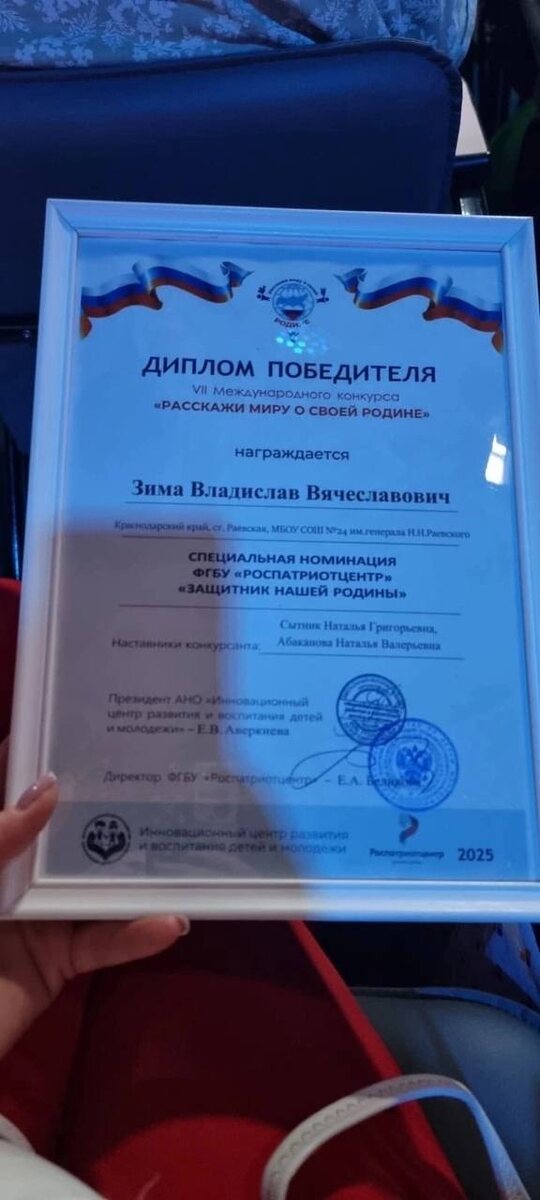 Мы спешим поздравить ученика 9 «В» класса МБОУ СОШ №24 имени генерала Н.Н. Раевского Зиму Владислава и его талантливых наставников, Сытник Наталью Григорьевну и Абаканову Наталью Валерьевну, с блестящей победой в Международном конкурсе "Расскажи миру о своей Родине"! Этот конкурс – престижное и масштабное мероприятие, собирающее юных таланты из разных стран мира. Участникам предстояло продемонстрировать глубокое знание истории, культуры и традиций своей Родины, а также умение ярко и увлекательно представить ее богатства международной аудитории. Желаем дальнейших творческих успехов, вдохновения для новых проектов и, конечно же, новых ярких побед! Мы уверены, что это лишь начало вашего пути к еще большим свершениям!