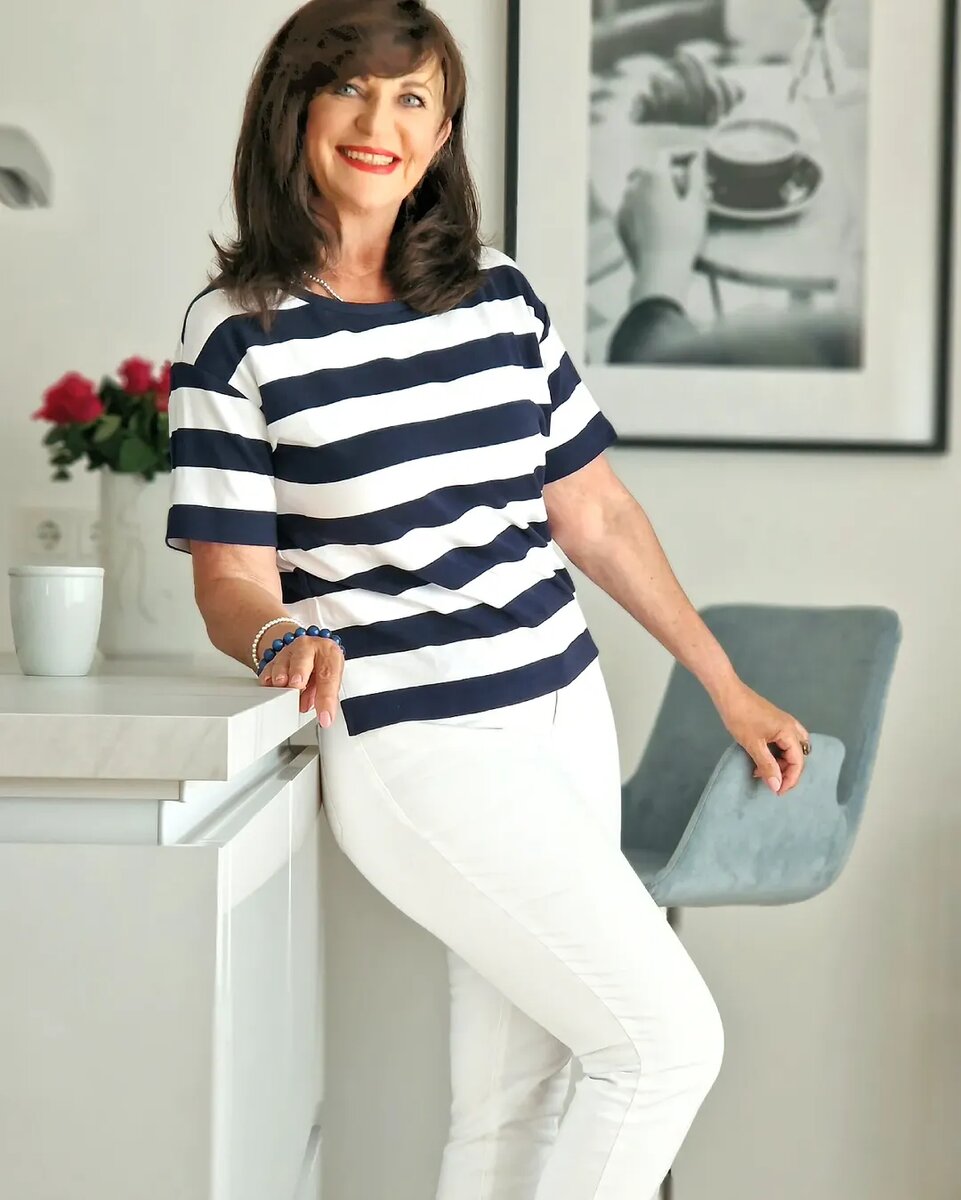 В первом образе — очень удачное сочетание белых зауженных брюк с футболкой в крупную горизонтальную полоску. Такой комплект безопасен практически для любой фигуры: белый цвет освежает, а плотная ткань не просвечивает, не подчёркивает рельефы живота и бедер. Обратите внимание на плотность ткани — именно она играет решающую роль в зоне бедер после 50.