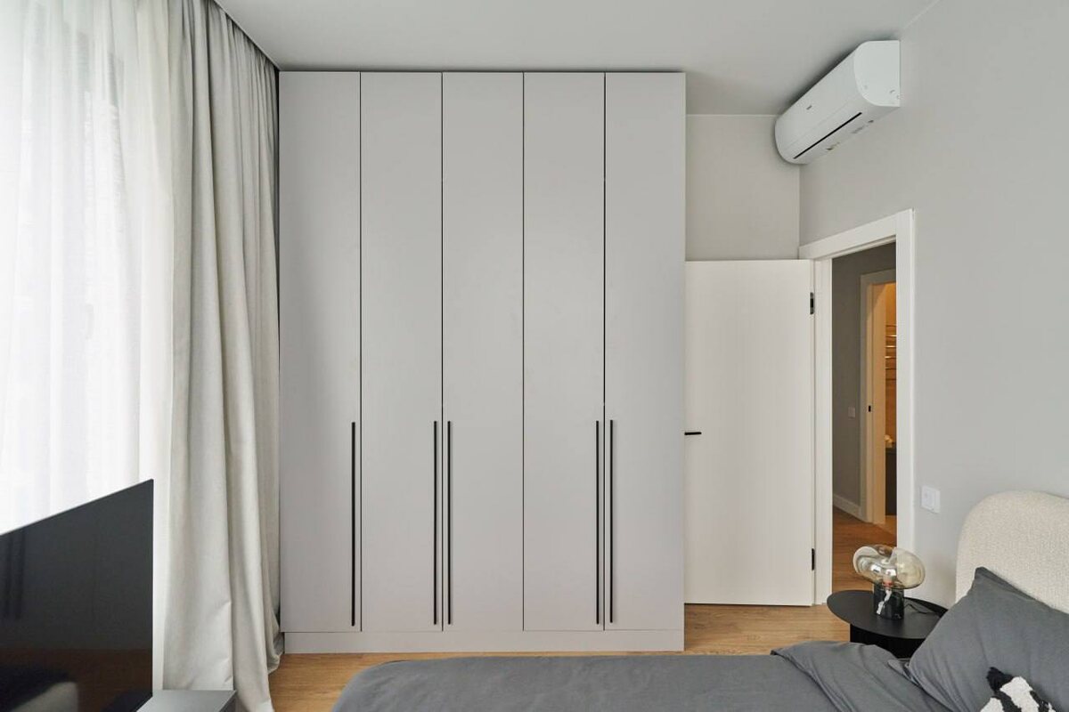 В этой спальне каждая деталь выверена до полутона. Кровать с мягким изголовьем в молочном оттенке приглашает к отдыху и создает ощущение покоя с первого взгляда. ✨ Черные прикроватные тумбочки и тумба под телевизор — как и вся мебель в проекте —подобраны нашей студией и задают уверенный графичный ритм, который поддерживает картина на стене. Пространство мягко окутано текстилем: прозрачный тюль фильтрует дневной свет, а тяжелые шторы добавляют уединения и глубины. Вместительный белый шкаф, словно растворяясь в пространстве, завершает композицию, оставаясь максимально функциональным и ненавязчивым.