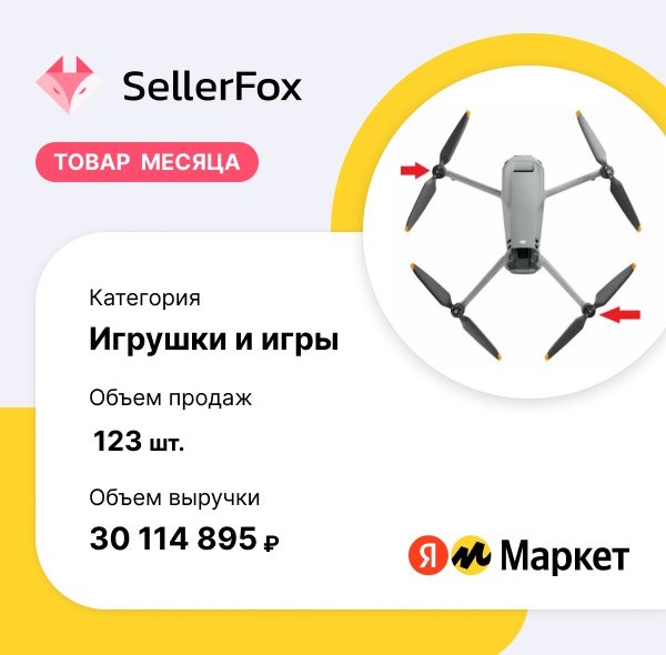 Дрон Mavic 3 стал лидером по объему выручки на Яндекс.Маркете за последние 30 дней в категории "Игры и игрушки". Товар за месяц приобрели более 120 раз на общую сумму свыше 30 млн рублей. Отметим, что по количеству продаж в этой же категории лидером месяца были игрушечные деньги.
