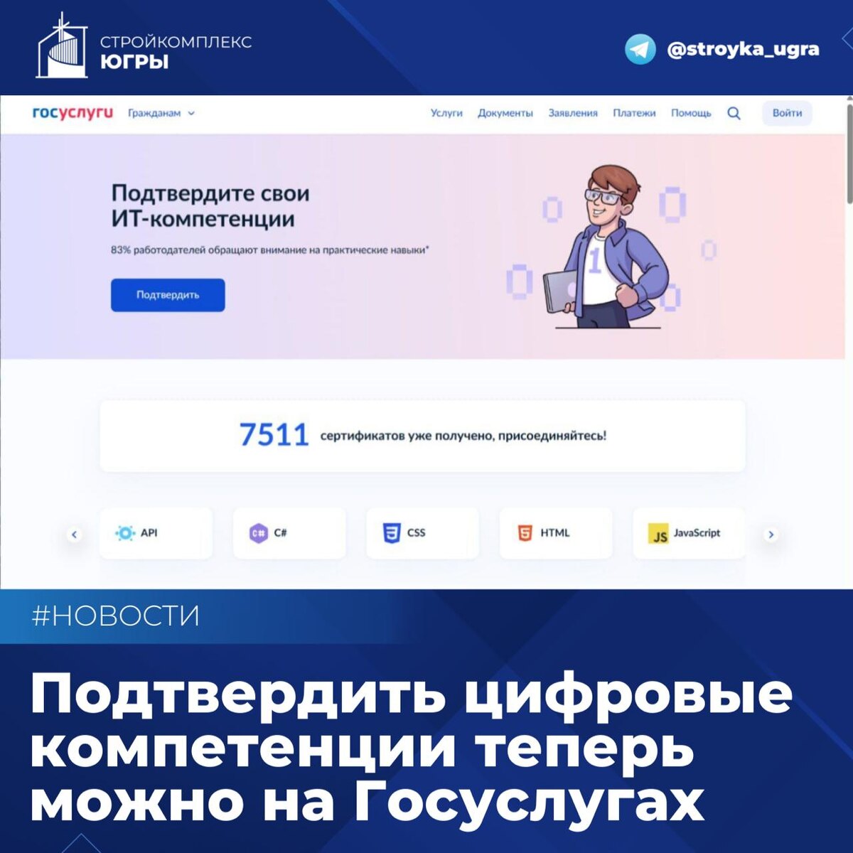 Подтвердить цифровые компетенции теперь можно на Госуслугах 👥 Новый сервис поможет строительным компаниям в найме квалифицированных специалистов. На платформе "Госуслуги" появилась возможность бесплатного тестирования по ключевым ИТ-навыкам и получения сертификата Минцифры установленного образца. Это даст возможность работодателям быстрее находить кандидатов, а соискателям — выгодно выделяться на рынке. Инициатива - часть нового национального проекта «Экономика данных». 🔵 На платформе специалисты могут пройти тестирование по широкому набору ИТ-направлений: Python, Java, C#, SQL, HTML, PostgreSQL, API, CSS и другим. «Плюсы» для работодателя: 🔵 выделение релевантных кандидатов; 🔵 экономия времени при потоке откликов; 🔵 снижение нагрузки на HR-команду. «Плюсы» для соискателя: 🔵 сверить свой уровень с требованиями рынка; 🔵 подтвердить компетенции даже без профильного диплома; 🔵 выгодно выделиться среди других претендентов. В системе оценки предусмотрено 3 уровня: базовый, с