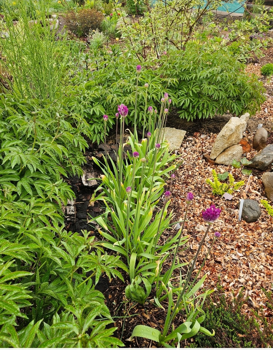 Жду машину, мучаюсь бездельем в буквальном смысле. Должны привезти груз из Ухты транспортной компанией - новый бассейн. Вес тяжёлый - 90 кг, поэтому сын заказал доставку до дачи, чтобы два пенсионера не размышляли над погрузкой и выгрузкой. Доставят до ворот, а там уже ссыпем на землю, да и разберём по деталям и перенесём на место. Это так, мелочи ожидания. Девам из чата в Ватсапе с утра предоставила наглядность набирающего цветоносы лука на фоне кустов пионов, посаженных полумесяцем. И луки не мешают, и пионам не тесно. Отцветут луки, начнут цвести пионы, луки срежутся под ноль и присыпятся щепой. Елена задала вопрос на прошлую заметку о стойке для петуний и клематисе под ней. ,,Комфортно ли тебе, сокол ясный, молодец прекрасный?" ,,Оии, матушка, больно дюже мне тут находиться, больно сладостно сидеть корнями под камушками. И еда, и вода, и кроты шарятся." Нормально ему, Лена, видишь, как попёр. На старом месте он только к середине июня первый нос показывал, остренький. Нынче же уж