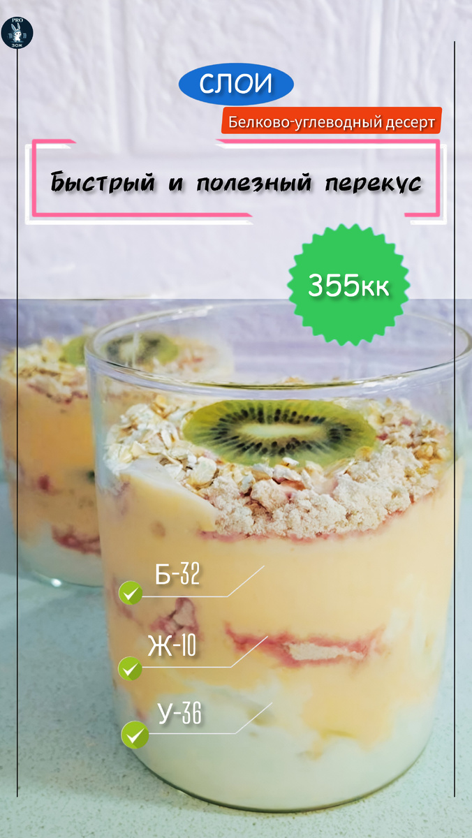 Многие диетические десерты не требуют много времени на приготовление и состоят из простых ингредиентов. Одним из таких десертов является «Слои » — быстрый и полезный перекус, который можно сделать всего за несколько минут. Способ приготовления: 1. Выложите ингредиенты слоями в следующей последовательности: 3 столовые ложки овсянки , 100 г творога ,1 киви и залейте 250 гр. йогурта. По желанию можно добавить орехи , сухофрукты или несколько скупов протеина . 2. Поставьте в холодильник на 2 часа. Приятного аппетита! 🍰