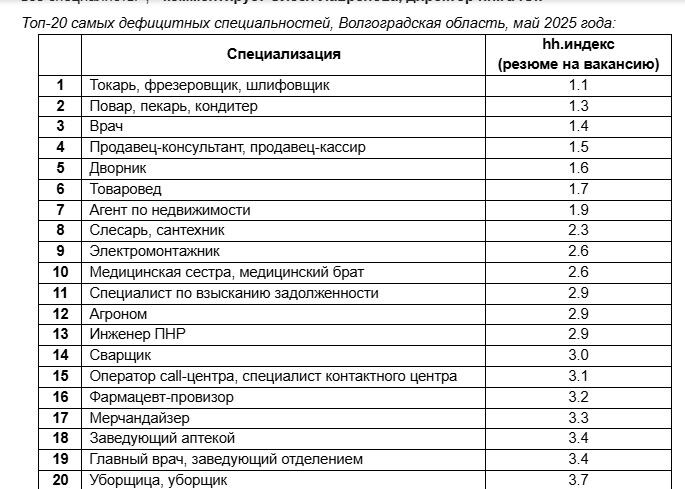 Названы самые дефицитные специалисты в Волгоградской области по итогам мая. Такими данными поделилась платформа онлайн-рекрутинга hh.ru. В мае 2025 года в Волгоградской области в первую пятёрку самых дефицитных попали токари, повара, пекари, кондитеры, врачи, продавцы и дворники. Теми сферами, где острее всего ощущается дефицит в области в начале года, являются розница — здесь поступает всего по два резюме на вакансию (индекс падает — в марте было 2,3) и медицина — 2,8. Стоит отметить, что hh.индекс или индекс конкуренции, то есть количество резюме на вакансию, в норме должен быть от четырёх до восьми, показатели меньше четырёх говорят о дефиците кадров, меньше двух — о выраженном кадровом голоде. Он ощущается в двадцати специальностях в Волгограде и области. Дефицит кадров в розничной торговле, по словам экспертов, наблюдается в течение как минимум последних 5-6 лет, особенно сильным он был в прошлом году. В начале этого года в Волгоградской области по-прежнему отмечается кадровый гол