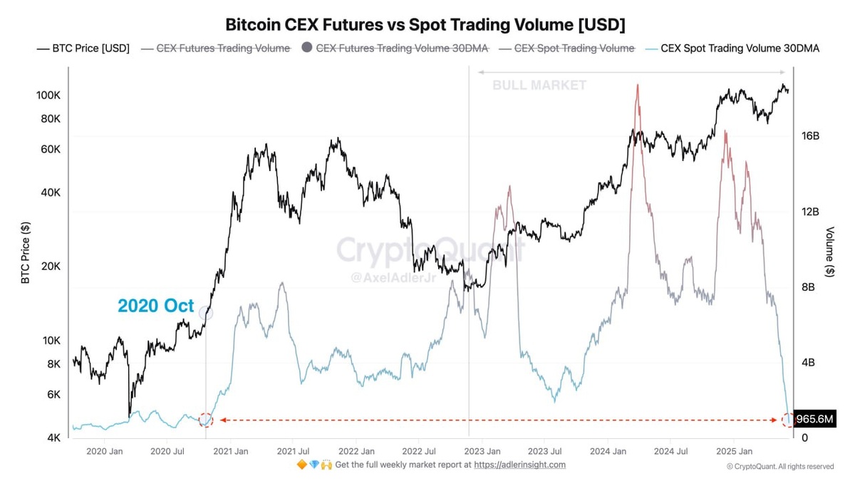 📊 Аналитики CryptoQuant: Средний объем спотовых торгов на централизованных биржах (CEX) упал до уровня октября 2020 г