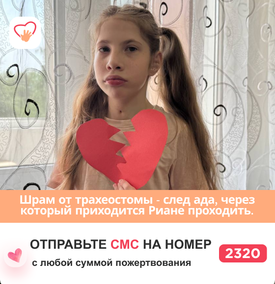 10-летняя Риана обожает музыку, с радостью рисует и мечтает. Но сейчас ей снова не до детства. Сердце не справляется. Протез, установленный в 2016 году, изношен. Давление в сердце растёт. Каждый день может стать последним. Врачи говорят: операция нужна срочно, тянуть больше нельзя. Здравствуйте, наши верные помощники! Риана мечтает о простом детстве и увидеть море. Любит мультики, игры, яркие платья и музыку. Риане 10 лет. И за это время она уже четырежды была на грани жизни и смерти. Сегодня всё повторяется. Давление в правом желудочке критически возросло. Нужна пятая тяжелейшая операция. Иначе её сердце может остановиться. Помогите Риане вылечить сердечко! Мама, Ирина, каждый день живёт между страхом и надеждой. Она не работает, потому что полностью занята уходом за дочкой-инвалидом. Всё держится на папе. Но сегодня им не справиться одним. Страшный диагноз Рианы появился ещё до рождения: на 36-й неделе маме сообщили, что у малютки наблюдается врождённый порок сердца плода. Диагноз