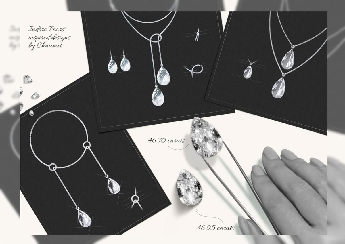 Несколько лет спустя, холодным октябрьским днем 1913 года, Тукоджи Рао Холкар III посетил парижский салон французского ювелира Chaumet, чтобы купить драгоценность для своей жены. Ему показали два крупных грушевидных бриллианта весом 46,70 и 46,95 карата, а также эскиз изящного ожерелья в стиле французского лавалье (подвеска, иногда с одним камнем, в центре ожерелья). Запрашиваемая цена? Более 631 000 франков (примерно 268 000 долларов США). Тукоджи вернулся на следующий день, чтобы заказать ожерелье с двумя редкими натуральными бриллиантами, позже названными «Индорскими грушами».