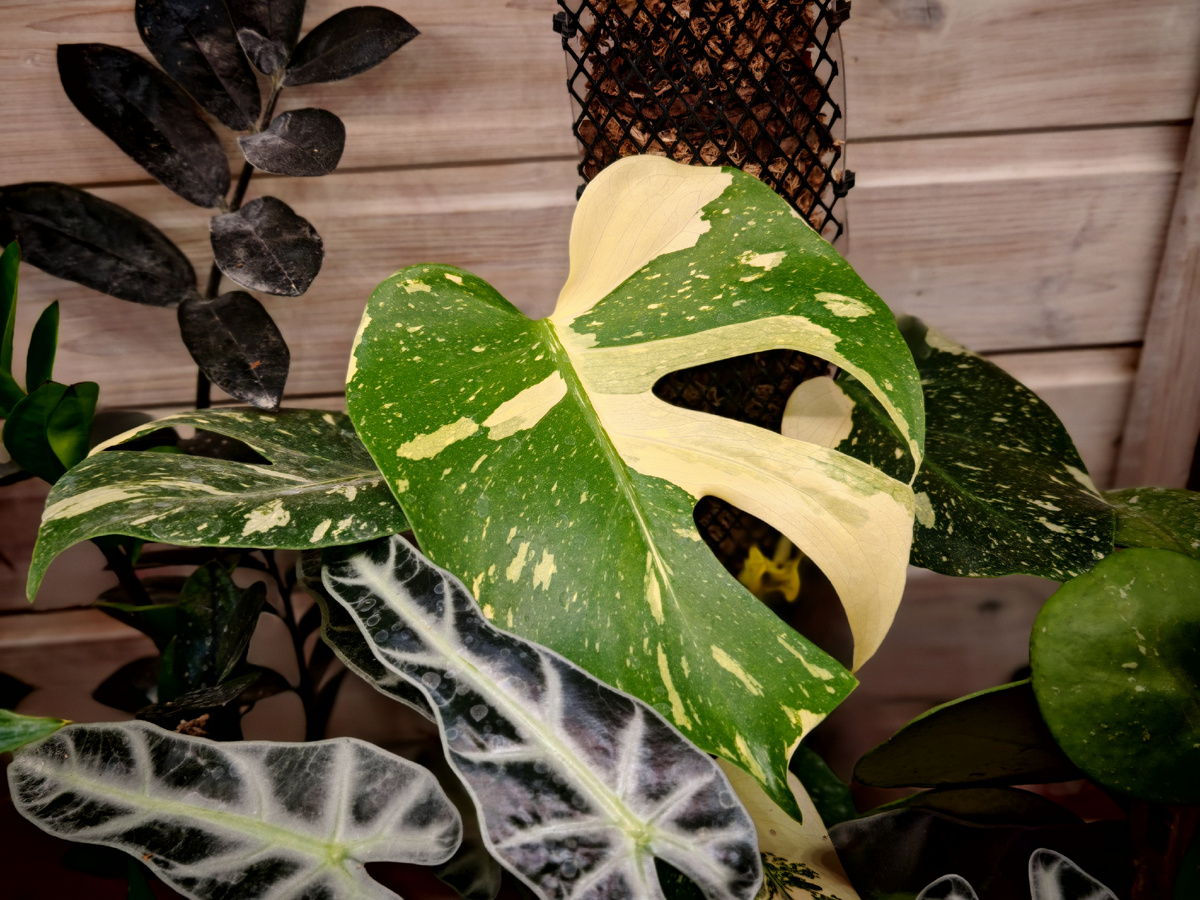 2. Энергетический дефицит. Чтобы поддерживать роскошную вариегатную листву, особенно у крупных экземпляров, нужна мощная корневая система. Любое повреждение корней сразу бьет по листьям. Monstera Thai Constellation очень четко держит баланс: при проблемах она жертвует листьями, особенно теми, где больше всего светлых пятен – они самые "энергозатратные".