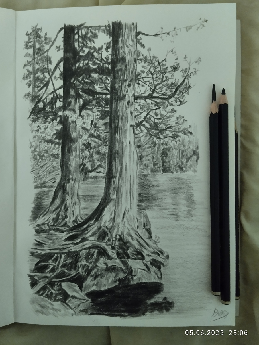 В этом пейзаже я опробовал новые карандаши Faber Castle Pitt Graphite Matt. Изначально мне показалось что эти карандаши сильно уступают тем которыми я рисовал до этого, марки "Малевич". И те, и другие карандаши матовые, но карандаши Малевич больше на поминают уголь своими свойствами, Faber же ближе к обычным карандашам. Честно сказать сначала мне показалось что Faber уступают в плане выразительности, но порисовав ими подольше я изменил свою точку зрения. Кроме того, благодаря тому что карандаши матовые они гораздо меньше бликуют. В планах нарисовать ими что-нибудь более масштабное. Благодарю за внимание и желаю Вам творческих успехов.