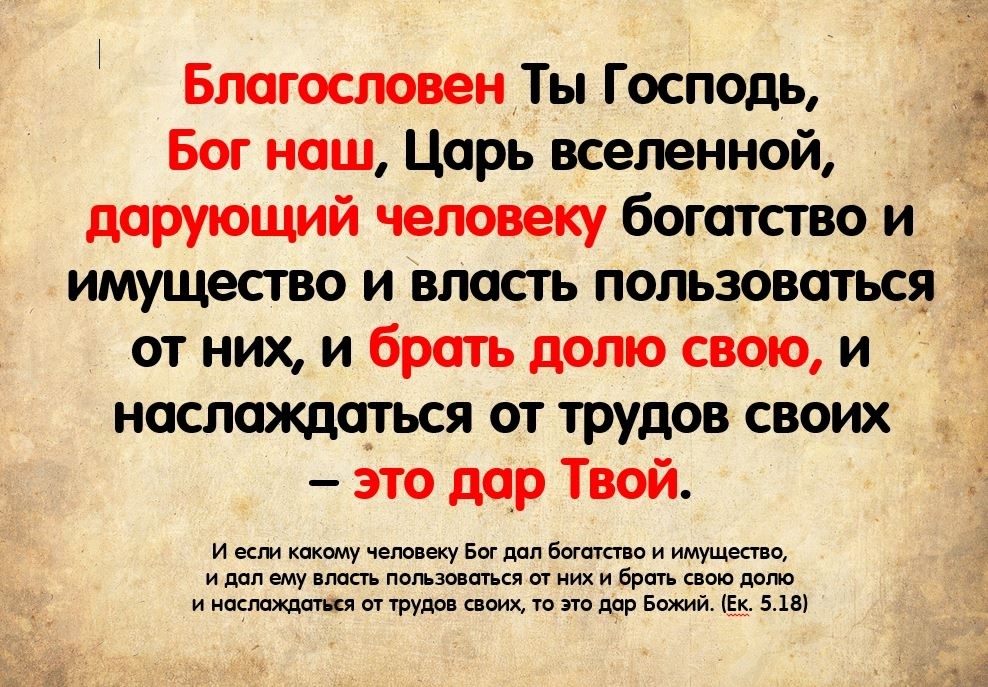БЛАГОСЛОВЕН ТЫ ГОСПОДЬ БОГ НАШ, ЦАРЬ ВСЕЛЕННОЙ, ДАРУЮЩИЙ ЧЕЛОВЕКУ БОГАТСТВО, И ИМУЩЕСТВО, И ВЛАСТЬ, ПОЛЬЗОВАТЬСЯ ОТ НИХ И БРАТЬ ДОЛЮ СВОЮ И НАСЛАЖДАТЬСЯ ОТ ТРУДОВ СВОИХ – ВСЁ ЭТО ДАР ТВОЙ.